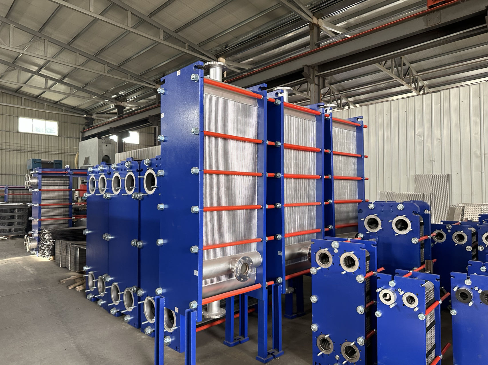 • Wärmetauscherplatten: Als zentrale Wärmeübertragungskomponenten werden sie aus korrosionsbeständigen Metallmaterialien wie Edelstahl, Titanlegierung und Hastelloy gestanzt und geformt. Die Oberfläche ist mit speziellen Mustern wie Fischgrätmuster und Wellung versehen, was die Wärmeübertragungsfläche erheblich vergrößert, die Flüssigkeitsstörung verstärkt, die Wärmeübertragungseffizienz verbessert und Ablagerungen und Ansammlungen reduziert.